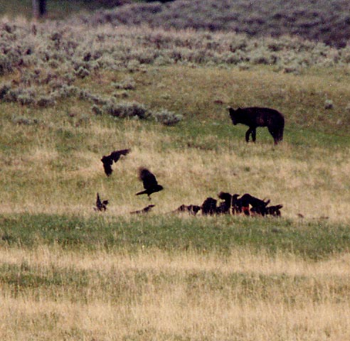 THIS BLACK YEARLING FROM THE DRUID PEAK PACK SEEMS TO BE HAVING "SECOND THOUGHTS" AFTER LEAVING THE CARCASS
